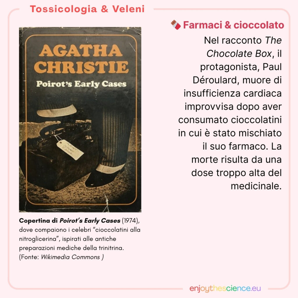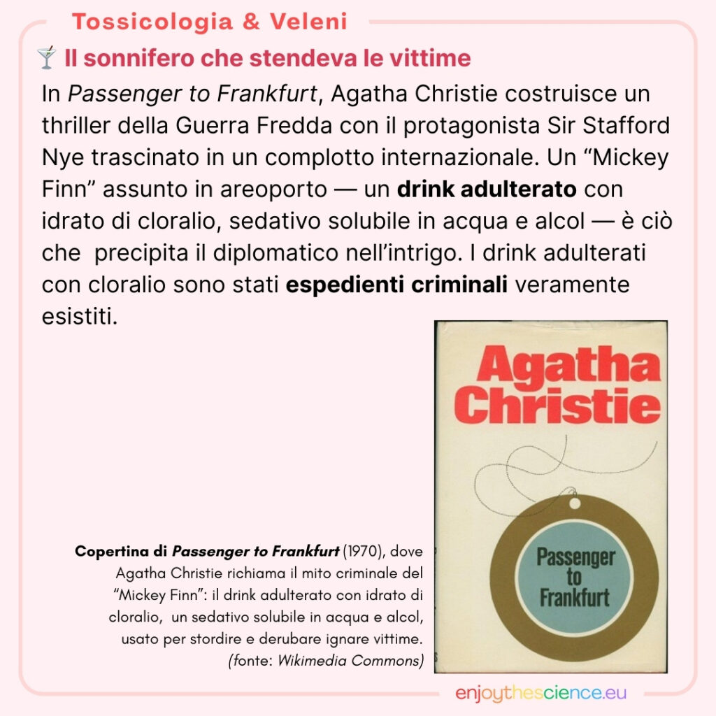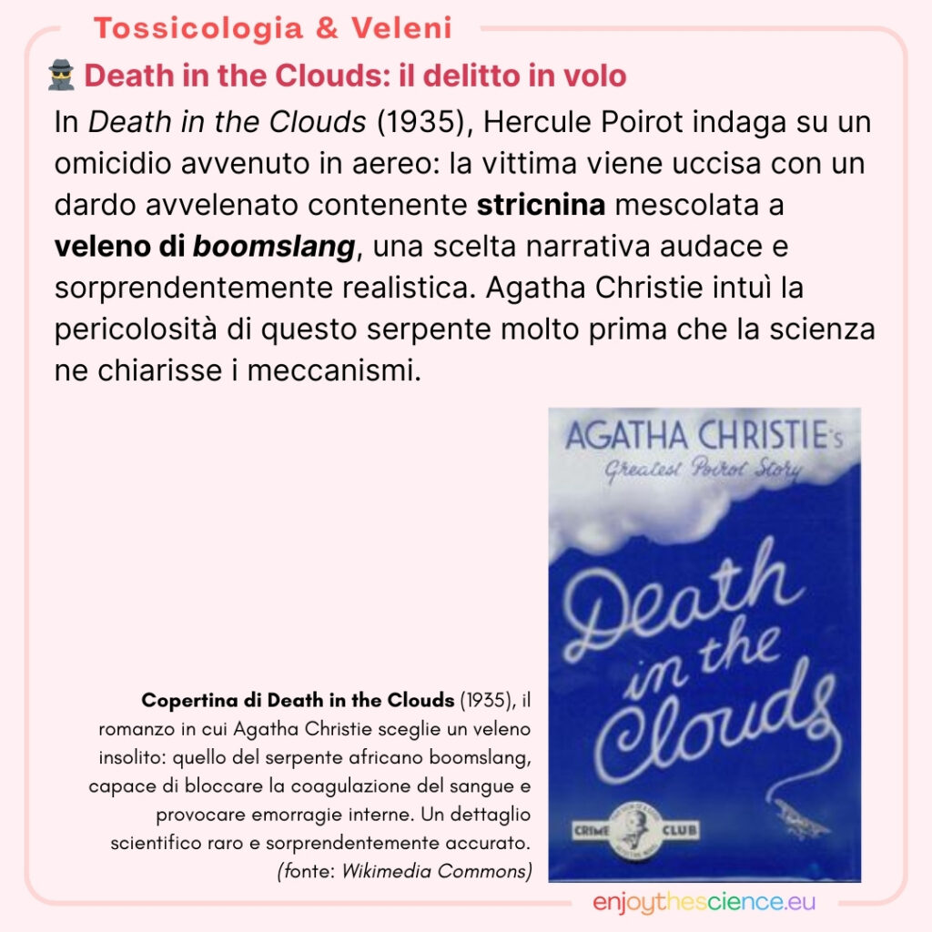 Prima di diventare la Regina del Giallo, Agatha Christie lavorò come assistente in un dispensario durante la Seconda guerra mondiale. Tra bilance, compresse e soluzioni imparò che la chimica è sia precisione…chee rischio. Da quell’esperienza nacquero alcuni dei suoi avvelanmenti più realistici: strofantina (da una freccia africana), trinitrina dal dolce sapore, l’ idrato di cloralio, fino al veleno del piccolo ma micidiale boomslang, capace di bloccare la cascata della coagulazione. Non invenzione letteraria, ma una farmacologia osservata e trasformata in letteratura.