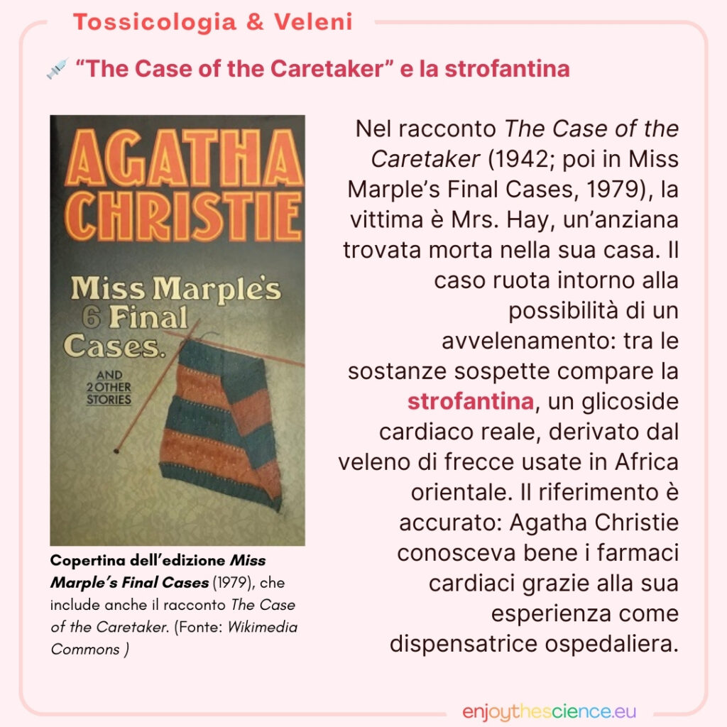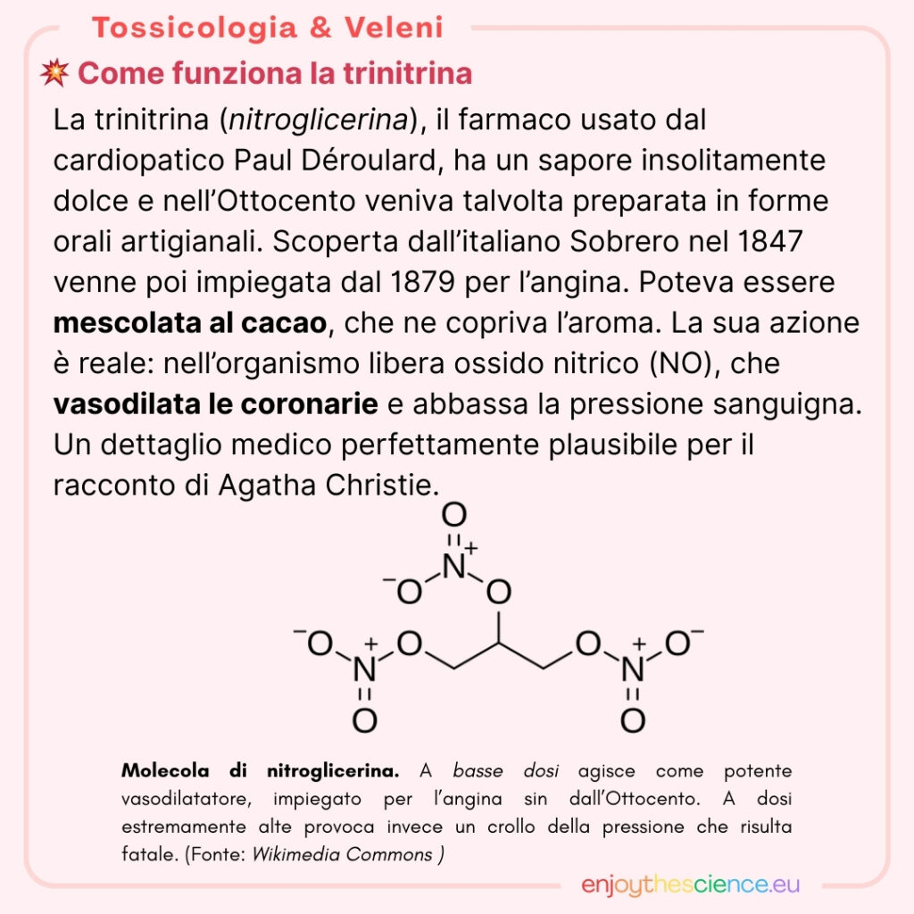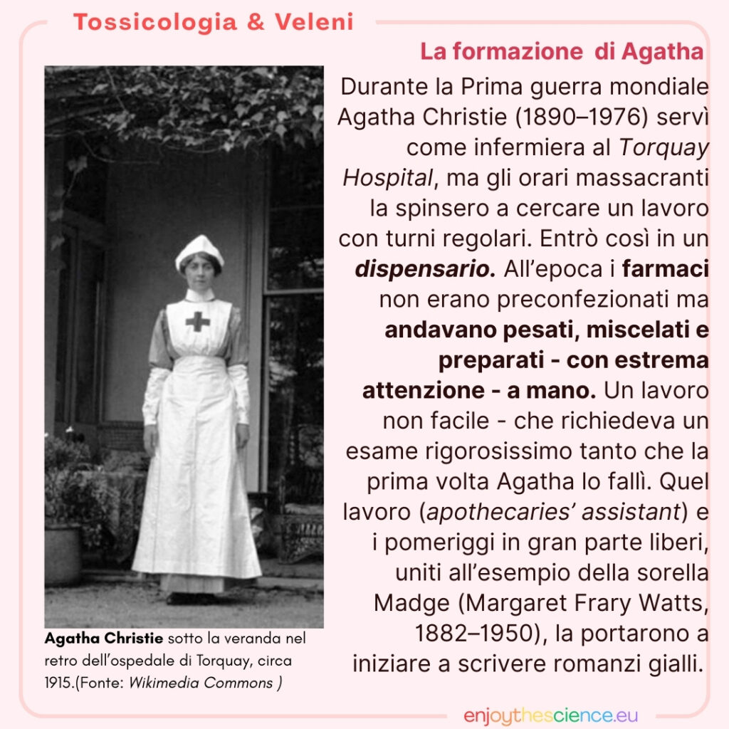 Prima di diventare la Regina del Giallo, Agatha Christie lavorò come assistente in un dispensario durante la Seconda guerra mondiale. Tra bilance, compresse e soluzioni imparò che la chimica è sia precisione…chee rischio. Da quell’esperienza nacquero alcuni dei suoi avvelanmenti più realistici: strofantina (da una freccia africana), trinitrina dal dolce sapore, l’ idrato di cloralio, fino al veleno del piccolo ma micidiale boomslang, capace di bloccare la cascata della coagulazione. Non invenzione letteraria, ma una farmacologia osservata e trasformata in letteratura.