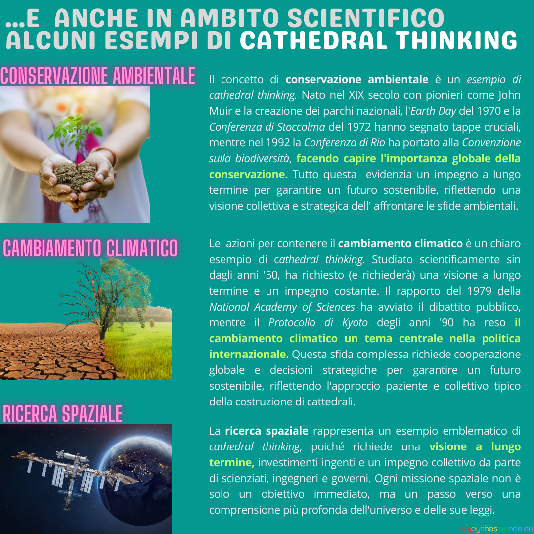 Oggi, il “Cathedral Thinking” si applica anche alla sostenibilità ambientale. Tematiche come il cambiamento climatico e la conservazione della biodiversità richiedono strategie a lungo termine, simili alla costruzione di una cattedrale, che possano garantire la sopravvivenza del pianeta.