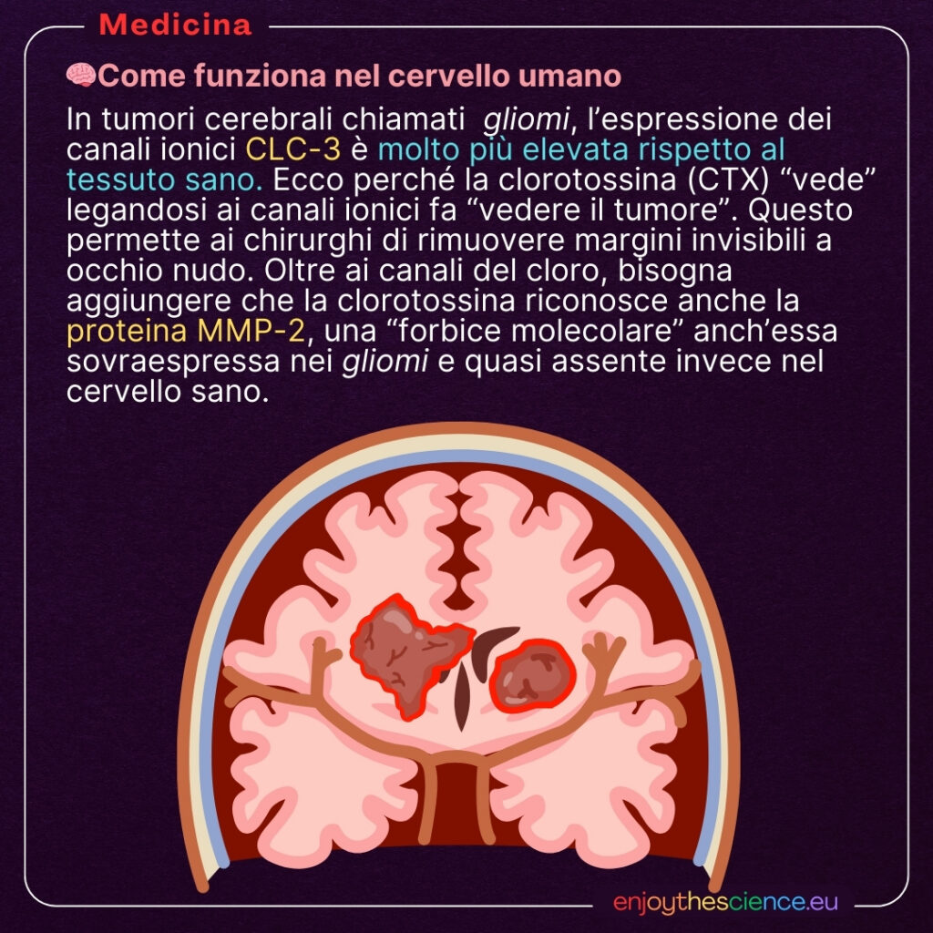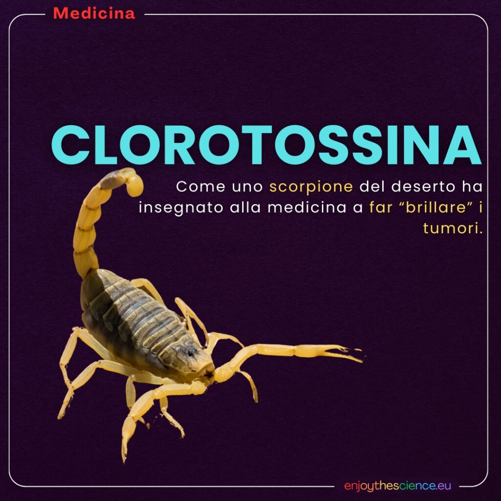 Dal veleno dello scorpione Leiurus quinquestriatus è stata isolata la clorotossina, un peptide di 36 amminoacidicapace di legarsi selettivamente ai gliomi. Accoppiata a un fluoroforo (Cy5.5) e attivata con luce a 675 nm, la molecola fa brillare il tumore durante l’intervento, rendendone visibili i margini invisibili a occhio nudo e risonanza magnetica. Una tecnologia ancora sperimentale, ma promettente: il veleno diventa strumento di visione chirurgica.