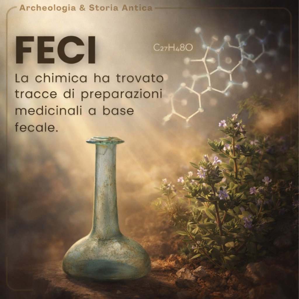 L’analisi con gas-cromatografia e spettrometria di massa ha identificato coprostanolo, uno sterolo prodotto quando i batteri intestinali trasformano il colesterolo. La presenza di questa molecola indica una contaminazione da feci. Nel recipiente è stato trovato anche carvacrolo, composto aromatico del timo con attività antimicrobica. L’associazione tra carvacrolo e tracce di feci suggerisce preparazioni terapeutiche complesse nella medicina romana.