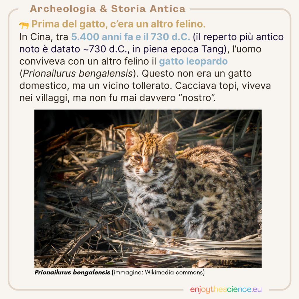 Il gatto domestico non nasce da un vero addomesticamento. Studi di DNA antico mostrano che la convivenza con l’uomo iniziò come commensalismo, legato ai magazzini di grano e ai roditori. Per secoli molti gatti erano in realtà gatti selvatici. L’antenato principale del gatto domestico, Felis lybica, si diffonde tardi, circa 2.000 anni fa, seguendo le rotte dell’Impero Romano. Il gatto non è stato domato: ha scelto di restare vicino all’uomo.