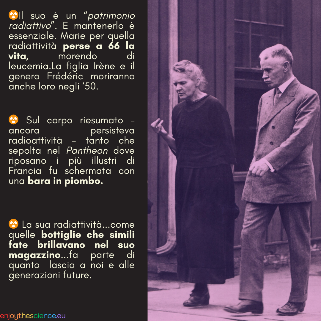 Quando il suo corpo fu riesumato per la traslazione al Pantheon di Parigi nel 1995, il feretro dovette essere schermato con una bara di piombo, tanta era la radioattività residua. Oggi le sue carte e i suoi quaderni, ancora debolmente radioattivi, sono consultabili solo con autorizzazioni speciali e guanti protettivi. La sua eredità è un patrimonio radioattivo: una traccia luminosa che non appartiene solo alla storia della scienza, ma anche alla memoria dell’umanità.