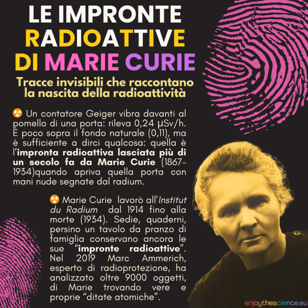 Un contatore Geiger vibra davanti al pomello di una porta: il valore segna 0,24 μSv/h. Poco sopra il fondo naturale (0,11 μSv/h), ma sufficiente a rivelare qualcosa di straordinario: è l’impronta radioattiva lasciata più di un secolo fa da Marie Curie (1867–1934), quando apriva quella porta con mani nude segnate dal radium. Non è un residuo casuale, ma la testimonianza concreta e silenziosa della nascita della radioattività.