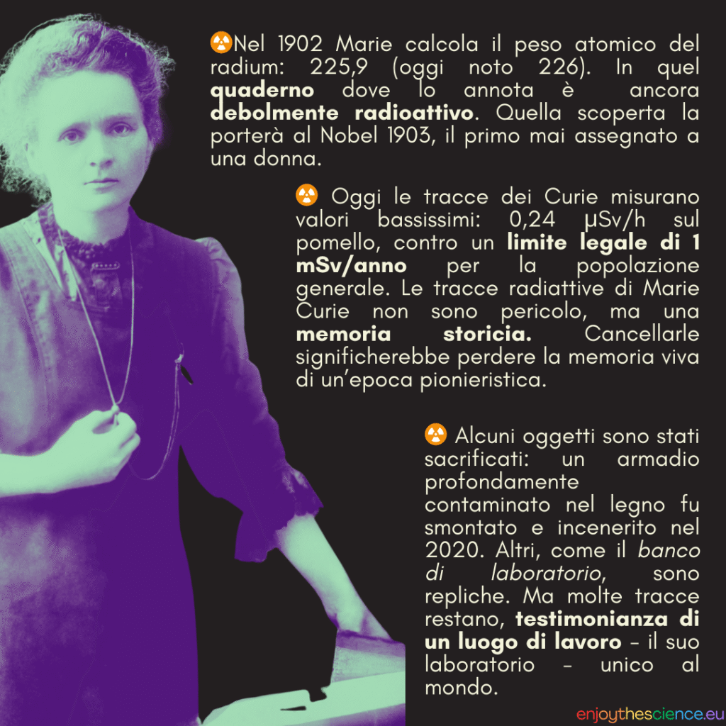 Dal 1914 fino alla sua morte, Marie Curie lavorò all’Institut du Radium di Parigi. Sulle sedie, sui quaderni, persino sul tavolo da pranzo di famiglia, persistono tracce della sua attività: impronte radioattive che il tempo non ha cancellato. Nel 2019 lo specialista Marc Ammerich ha analizzato oltre 9.000 oggetti appartenuti alla scienziata, trovando una vera e propria “firma atomica” su materiali comuni come carta, legno e tessuti.