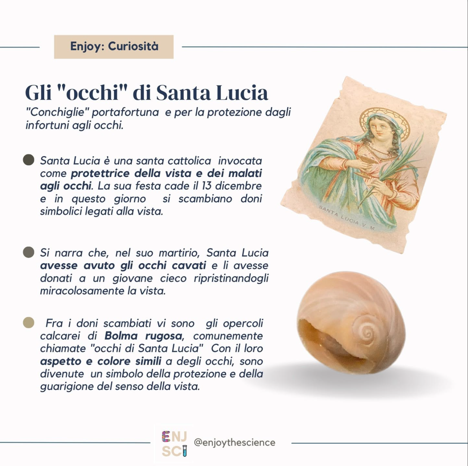 Gli Occhi di Santa Lucia, esposti al Museo Etnografico di La Spezia, sono piccoli oggetti dall’aspetto estremamente affascinante e che in sè racchiudono storia, arte e medicina. Queste “conchiglie”, conosciute anche come bolma rugosa, prendono il nome dalla Santa protettrice della vista, Santa Lucia, e sono strettamente legate alla Dottrina delle Segnature. Secondo questa antica credenza, la forma di un oggetto può indicare il suo potere curativo, e così le conchiglie, simili a piccoli occhi, venivano utilizzate come simboli di protezione per la vista.