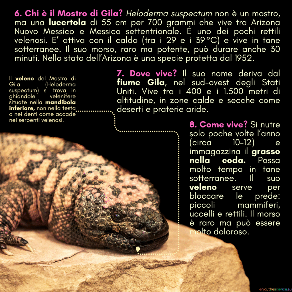 Il Mostro di Gila è un animale unico: lungo circa 60 cm, pesa sui 700 grammi e si nutre solo 10-12 volte l’anno. Vive in tane sotterranee e accumula grasso nella coda, che può rappresentare il 30% del suo peso. Il suo “prezioso” veleno, prodotto nelle ghiandole salivari della mandibola, viene inoculato lentamente tramite denti scanalati. Doloroso, sì, ma raramente letale.