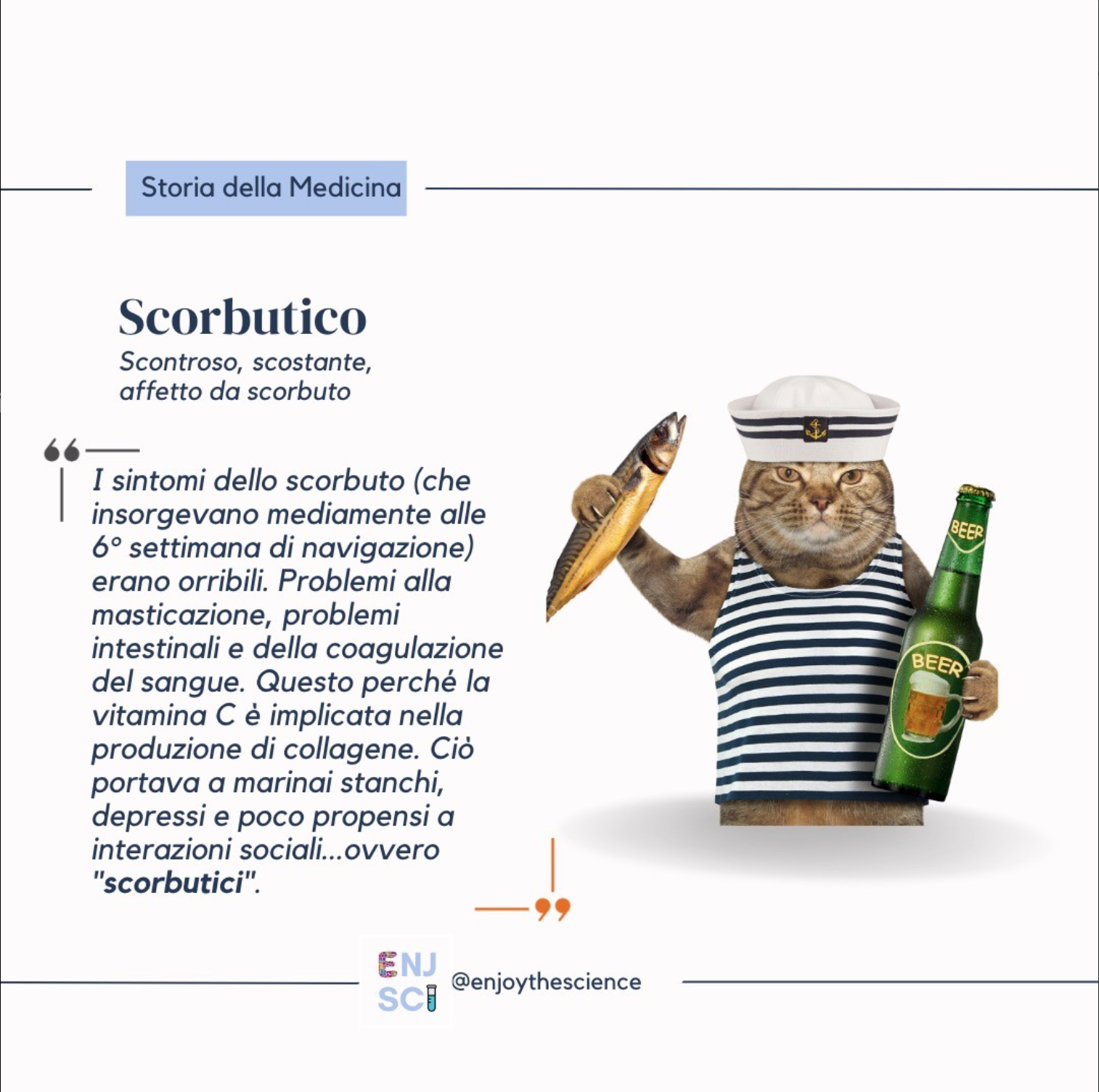 Lo scorbuto è una malattia provocata dalla mancanza di vitamina C, essenziale per la sintesi del collagene. Senza di essa, il corpo non riesce a mantenere la salute dei tessuti connettivi, portando a gengive infiammate, emorragie, e una serie di altri gravi sintomi. La parola “scorbuto” deriva dal termine scandinavo antico “skyr” (latte cagliato) e “bjurg” (edema), che indicano la natura frequente della malattia tra gli equipaggi del nord Europa, in particolare durante i lunghi periodi senza frutta e verdura fresca.