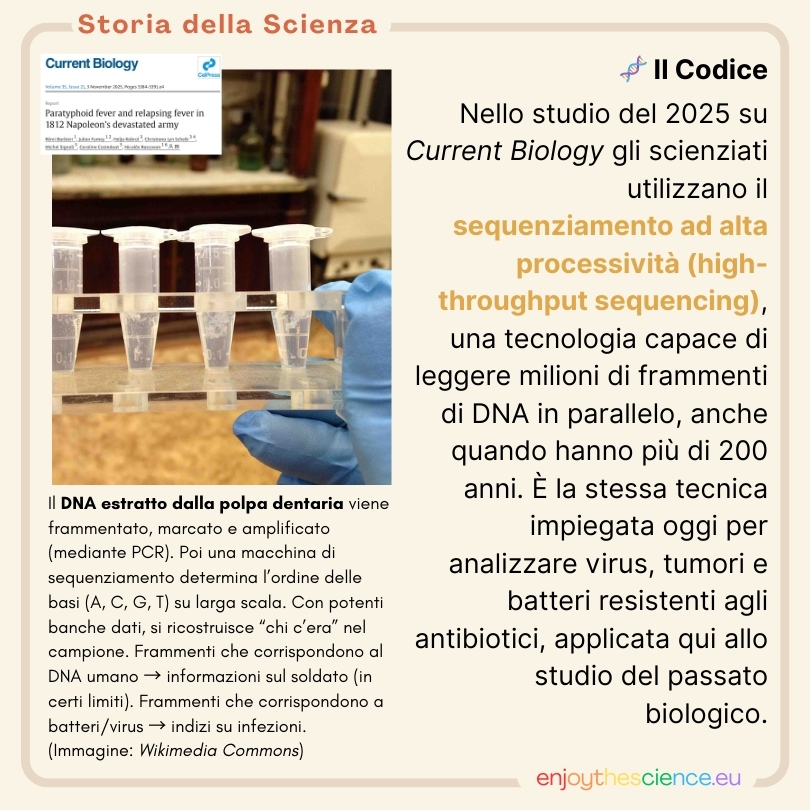 Nel giugno 1812 Napoleone attraversa il fiume Niemen, confine tra Europa napoleonica e Impero russo. Sei mesi dopo, della Grande Armée restano quasi nulla. Le analisi di DNA antico su resti dei soldati rinvenuti a Vilnius mostrano la presenza di Salmonella, Borrelia e altre infezioni concomitanti. Non una singola epidemia, ma un collasso biologico che si somma alla sconfitta militare.